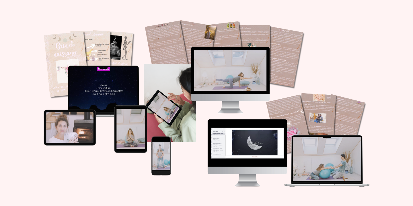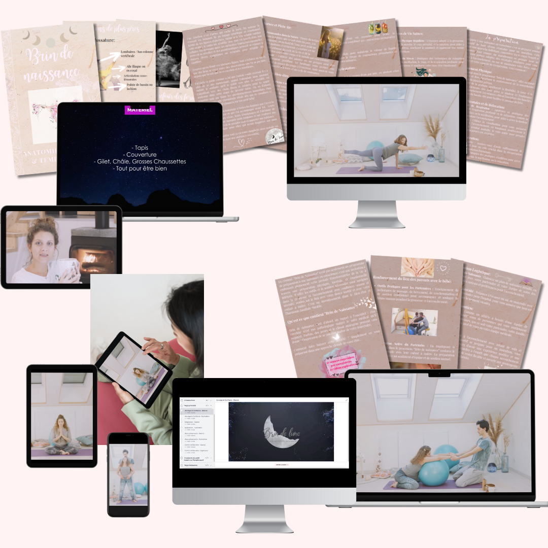Brin de naissance se déroule intégralement en ligne. Après inscription, vous aurez accès en tout temps aux contenus, 22 vidéos réparties en 5 chapitres : Yoga prénatal, Anatomie du petit bassin ou temple sacré, Yoga naissance, Yoga postnatal.